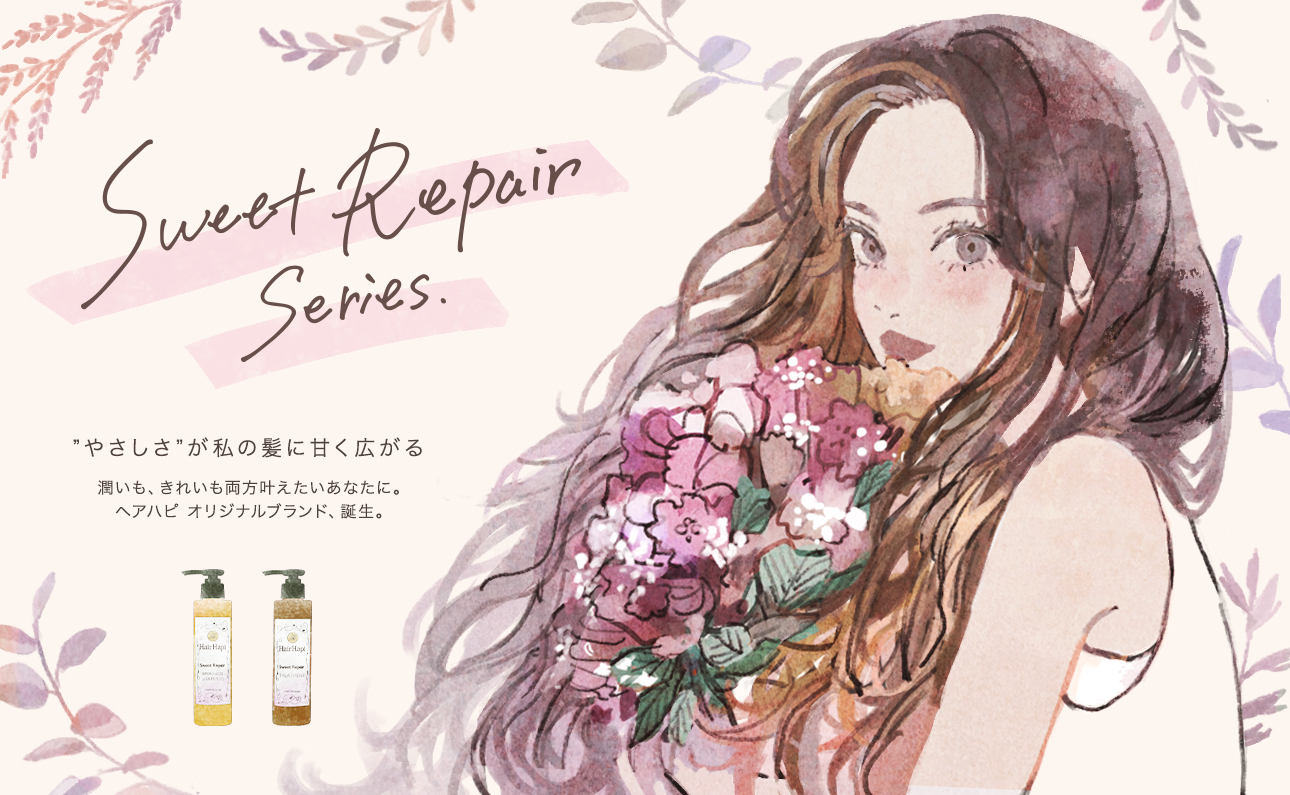 やわらかなサラサラヘアーに仕上がる、スイートリペアノンシリコンヘアケアシリーズ。パーマのウェーブやヘアカラーの美しい髪色もキープします。風になびく美しい髪を目指したい方へ。